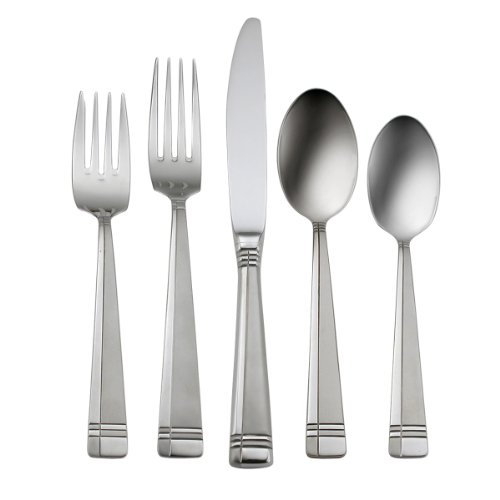 Amsterdam pattern service for 8 includes 8 each place fork, place knife, soup spoon and salad fork, 16 teaspoons, and 5 serving pieces including a butter, sugar, 2 tablespoons and a serving fork. 53-piece flatware set; 8 5-piece place settings; 5-piece serving set; 8 extra teaspoons Crafted of 18/0 stainless steel for shine and durability Bold contemporary pattern on oversized pieces Corrosion-res